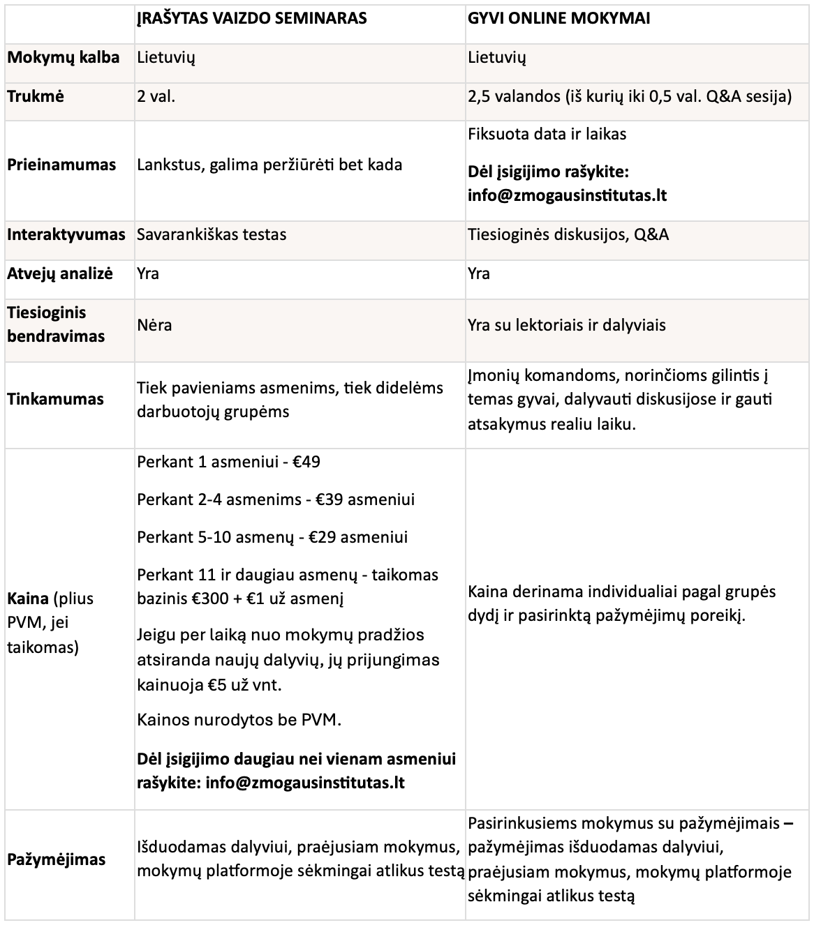 - GYVI ONLINE MOKYMAI (2,5 val.) – optimalus pasirinkimas skirtingose lokacijose esantiems darbuotojų kolektyvams ir komandoms, kurie vertina gyvą komunikaciją su lektoriais, galimybę užduoti klausimus bei gauti atsakymus.